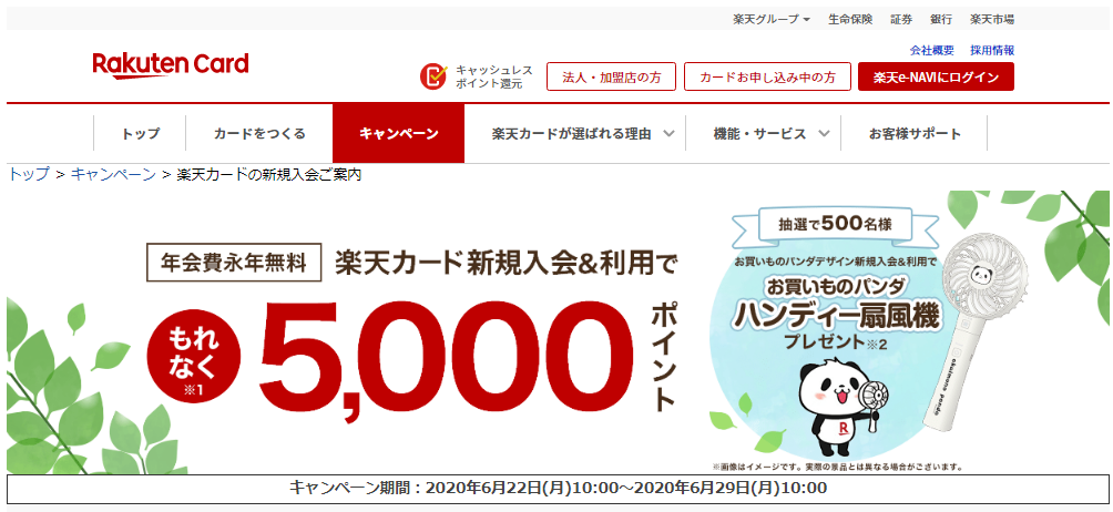 入会時にもらえるポイントが多く、おすすめのカードです。外出先での買い物などの通常のポイント還元率は1%。たまったポイントは楽天市場や提携のドラッグストアやファミリーマートなどで利用することができ、使い勝手がとてもいいです。